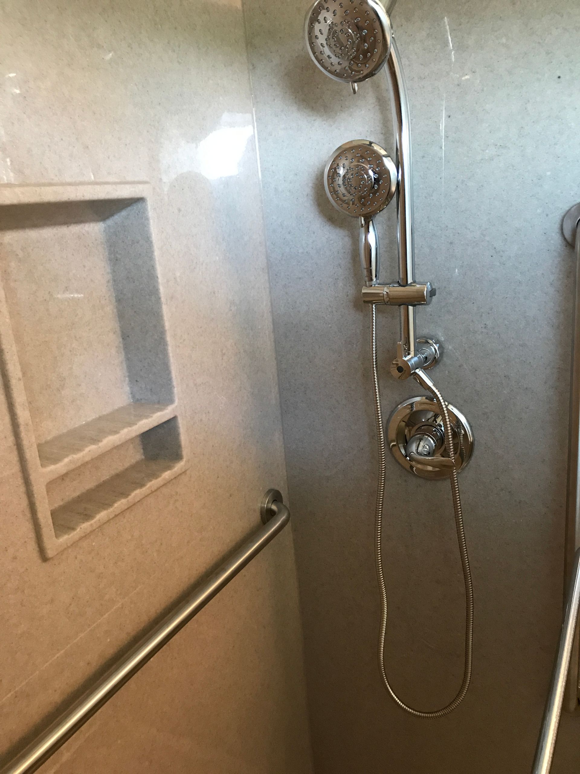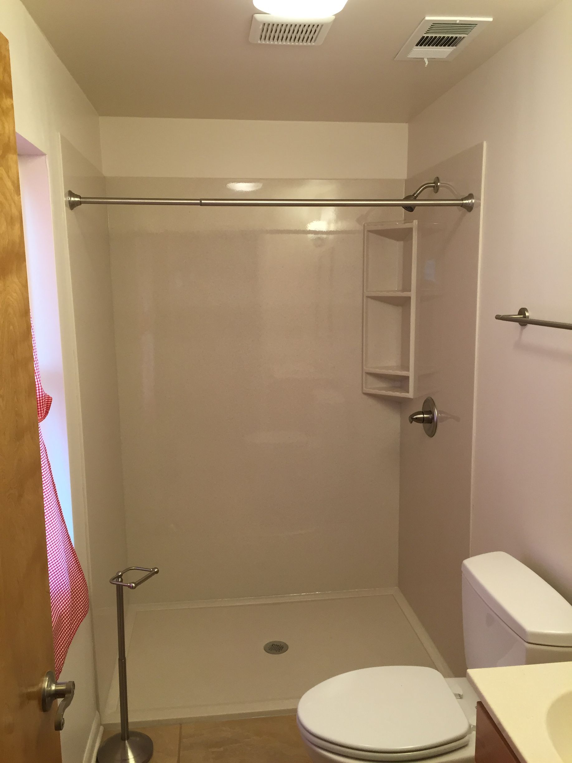 We can create a wet room as shown here with a ceiling hung shower curtain, or we can offer a barrier free shower, comfort height toilet and a vanity to allow for wheelchair access if needed.